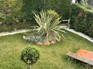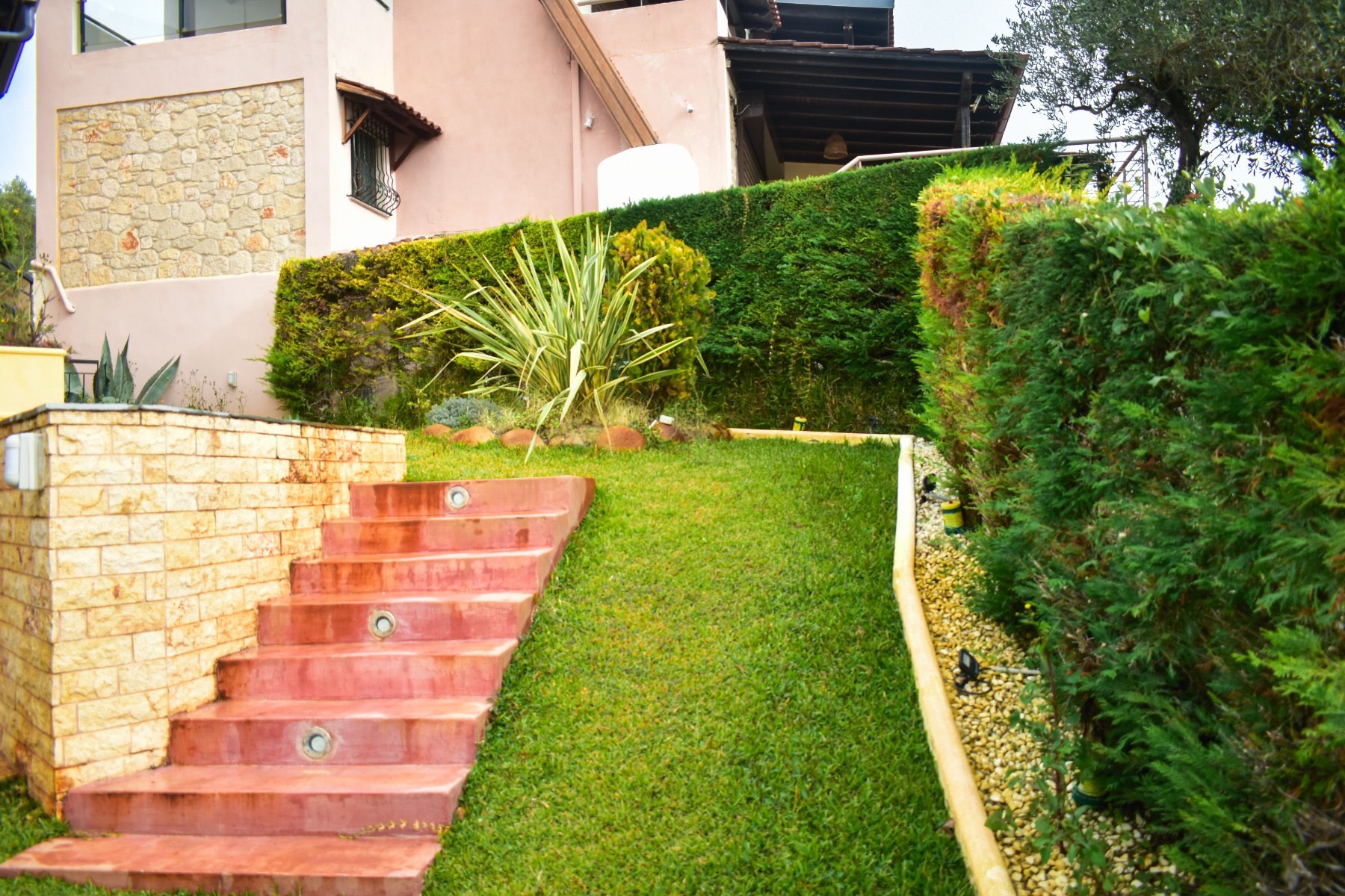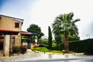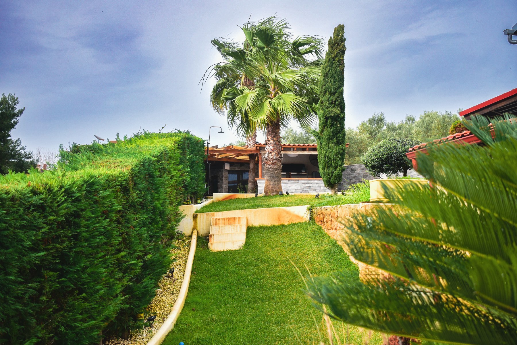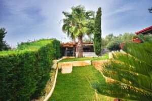 Duży ogród z palmami i cyprysami w idealnym stanie